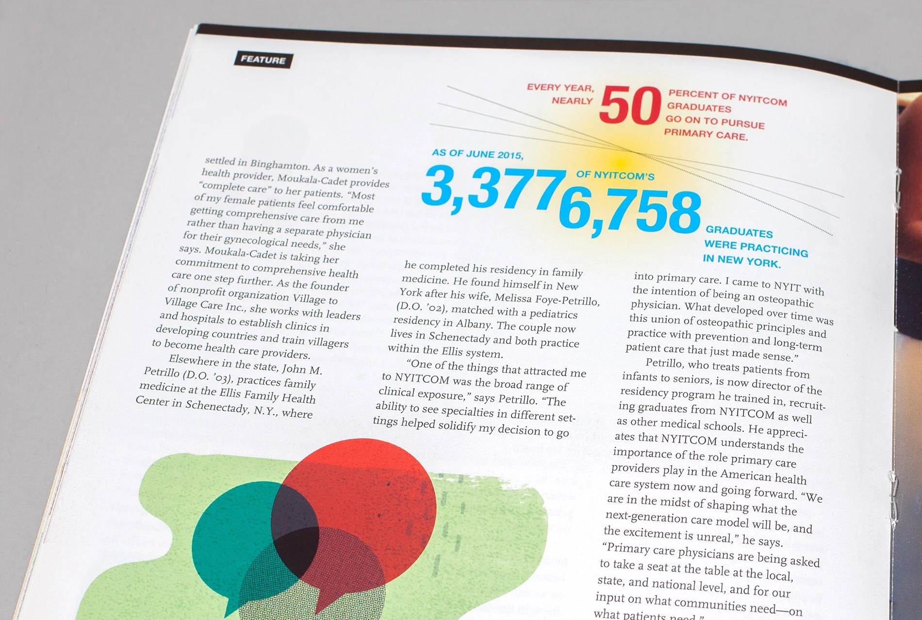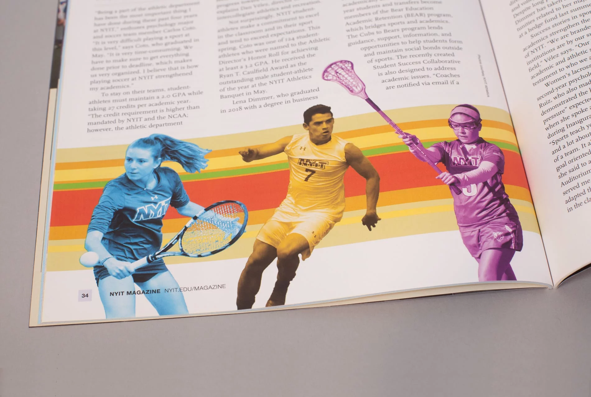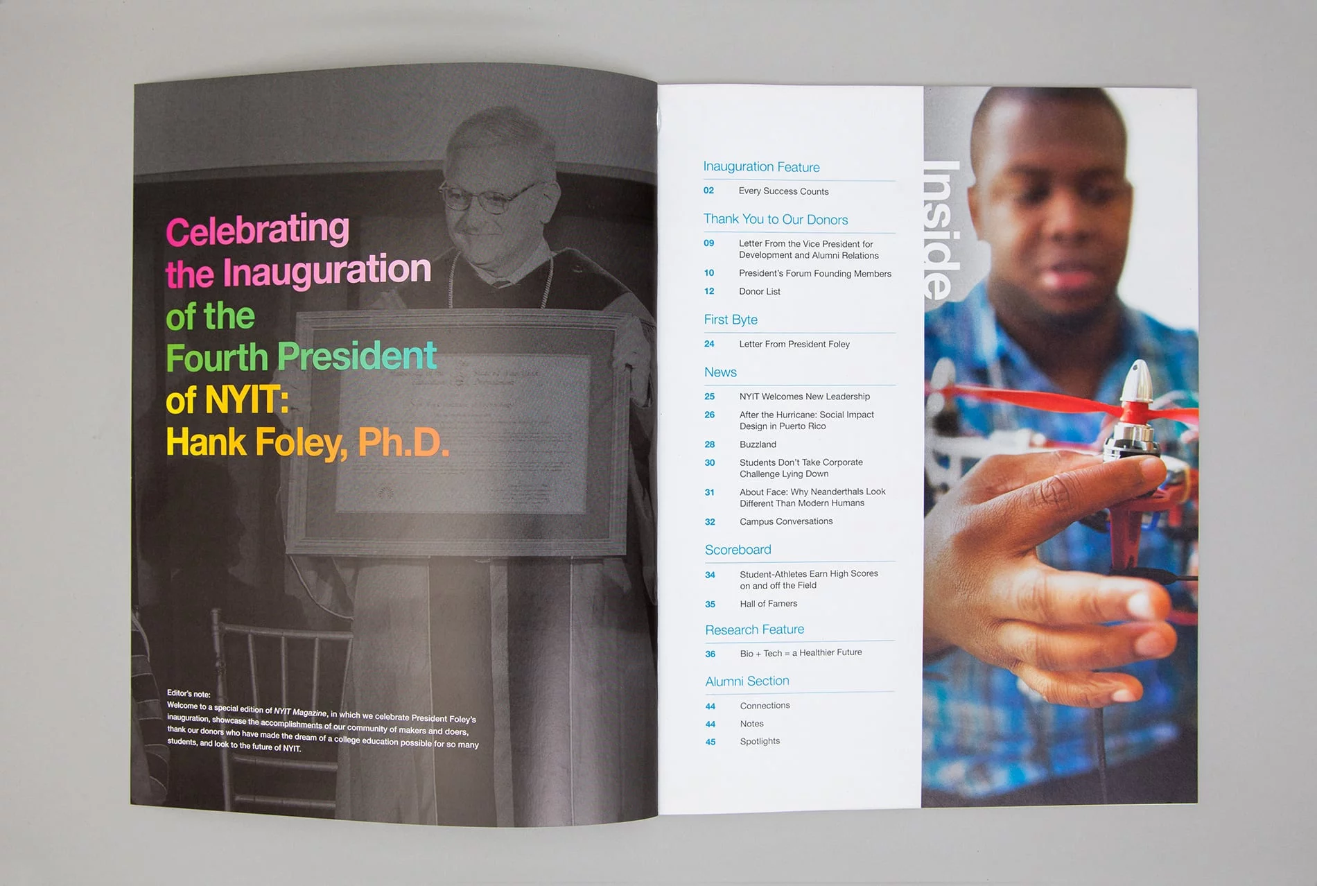 One of NYIT’s most important tools for outreach to its alumni is NYIT Magazine, published three times a year. The publication was in need of a radical update to compete with alumni magazines from other schools in the marketplace. Not only was the design outdated, but a new, progressive approach to written content required a contemporary presentation. The magazine needed to expand in order to better connect with alumni and appeal to current and prospective students and parents. It also needed to function as a fundraising tool to encourage alumni giving, and to entice corporate partners by proving to them the value of backing such an organization.