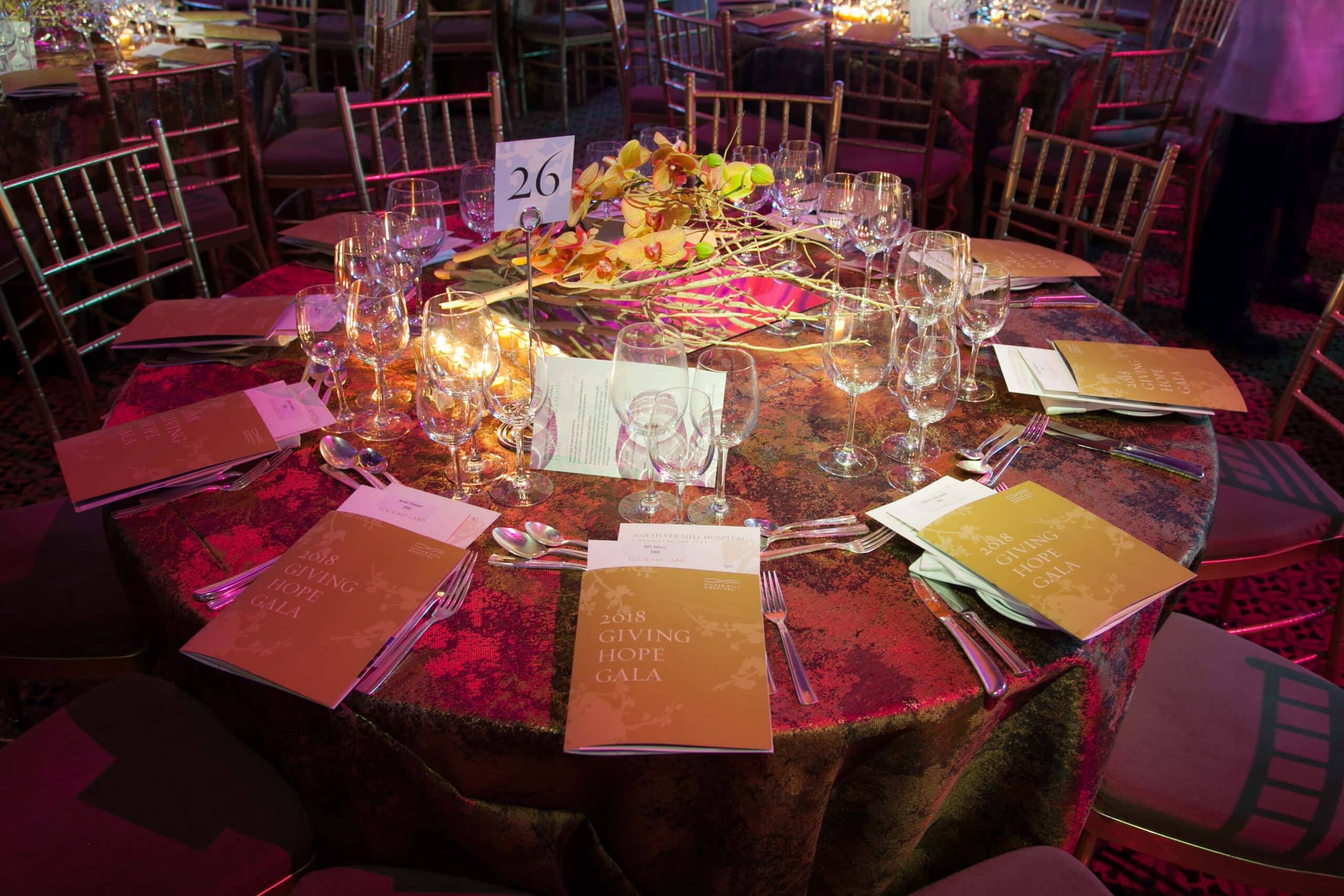 The hospital engaged me to create a look and feel to help brand the event, to be applied to an array of materials. These included large environmental graphics, projections, website imagery and identity guidelines, invitations and letterhead, menus, advertising, auction forms, and wayfinding.